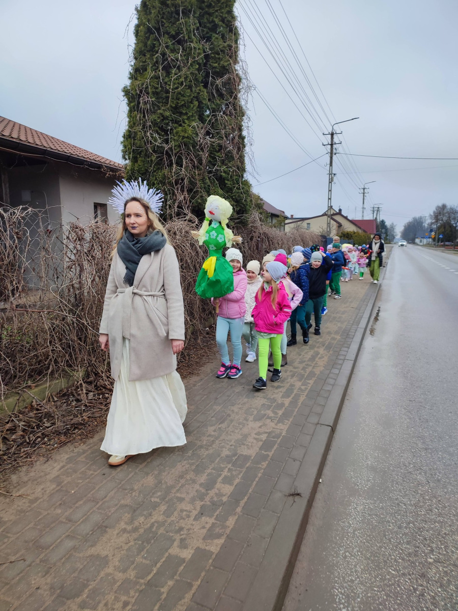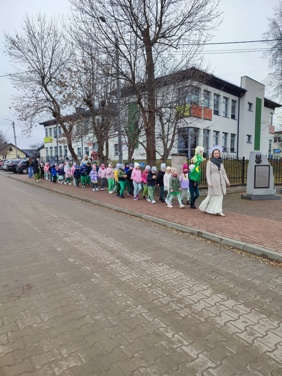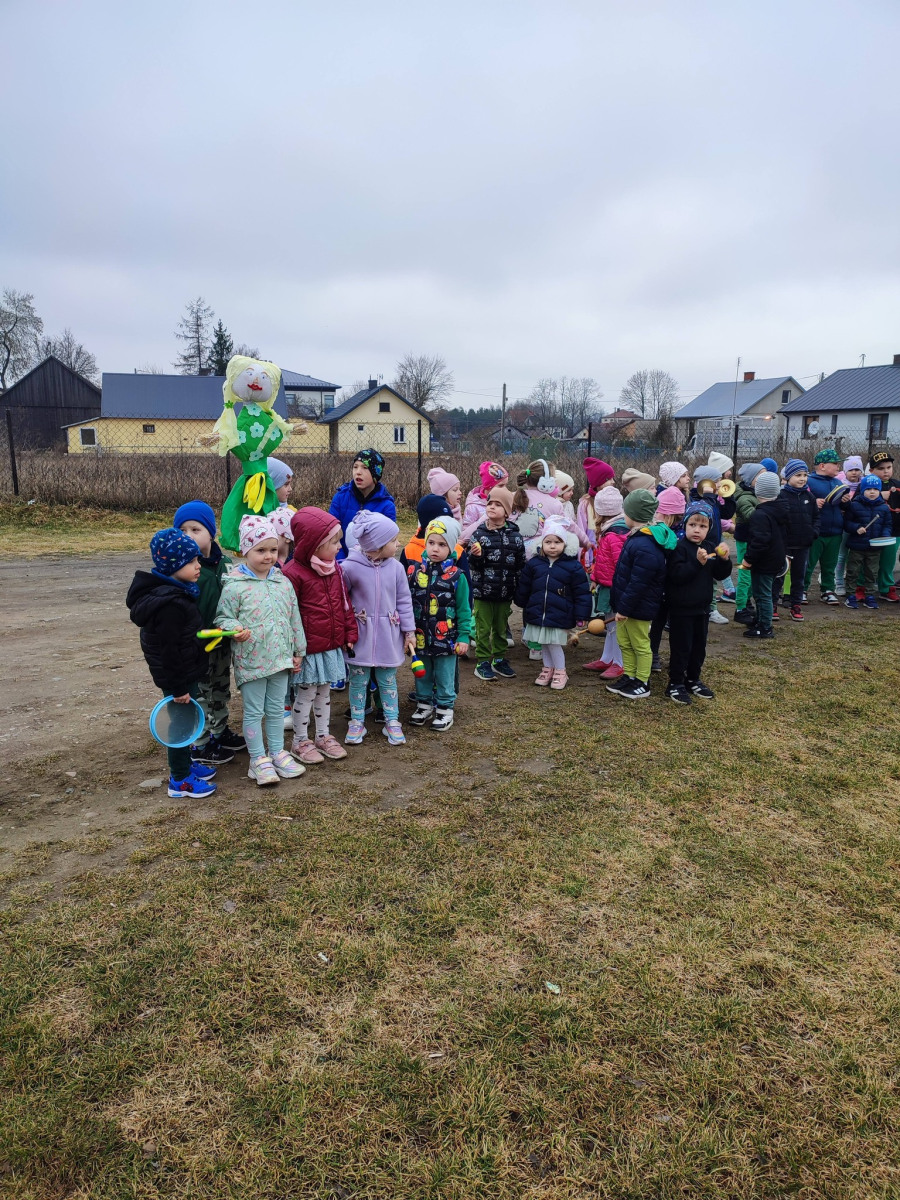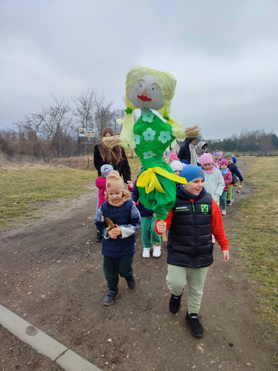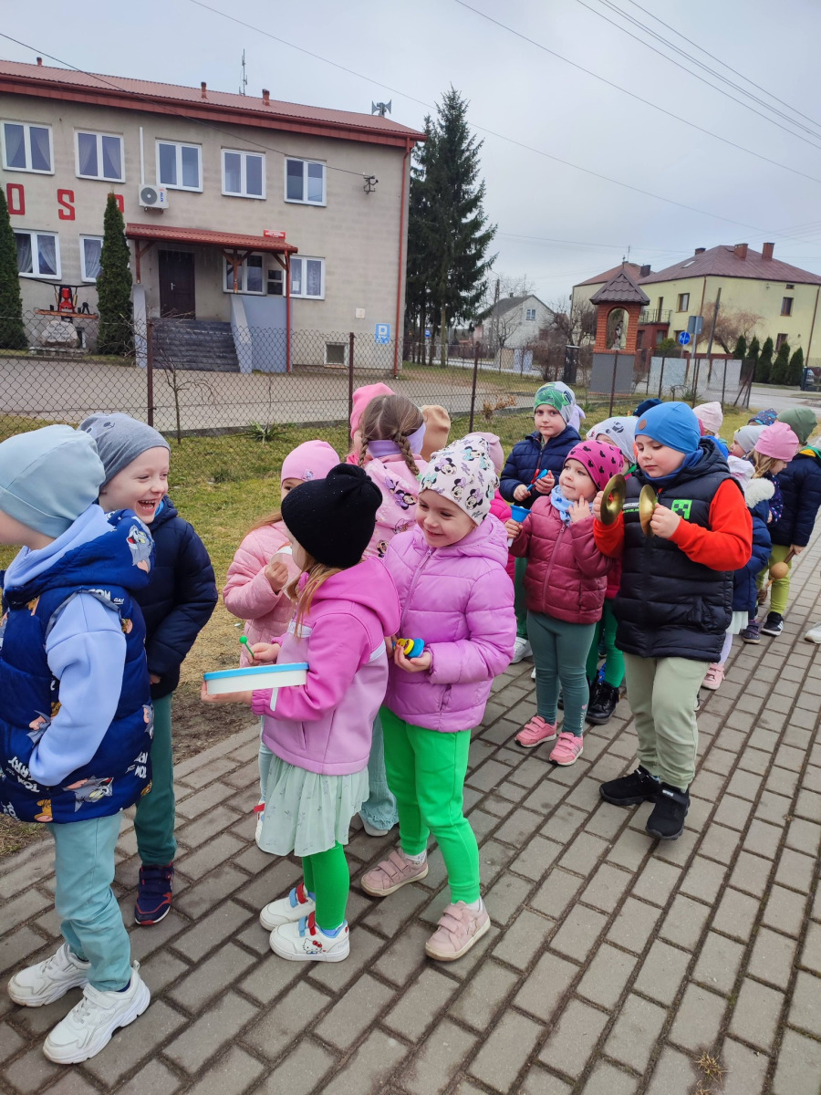 . Przedszkolaki maszerowały ulicami wsi, grając na instrumentach i śpiewając wesołe, wiosenne piosenki. Ich śmiech i muzyka niosły się daleko, jakby budząc przyrodę do życia.