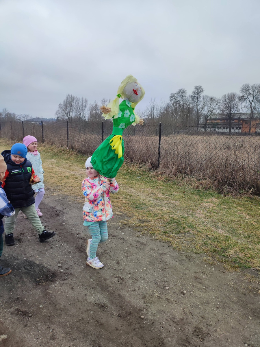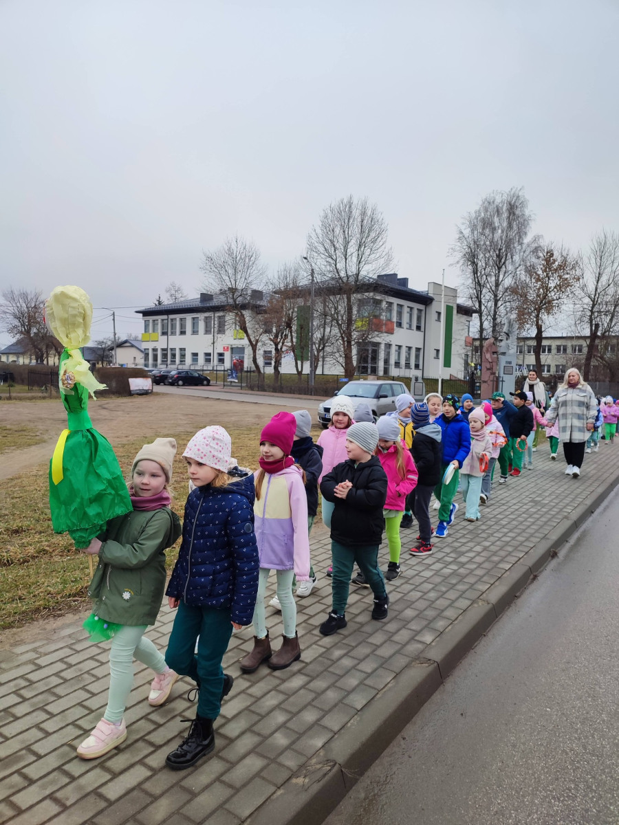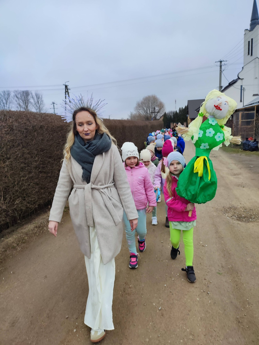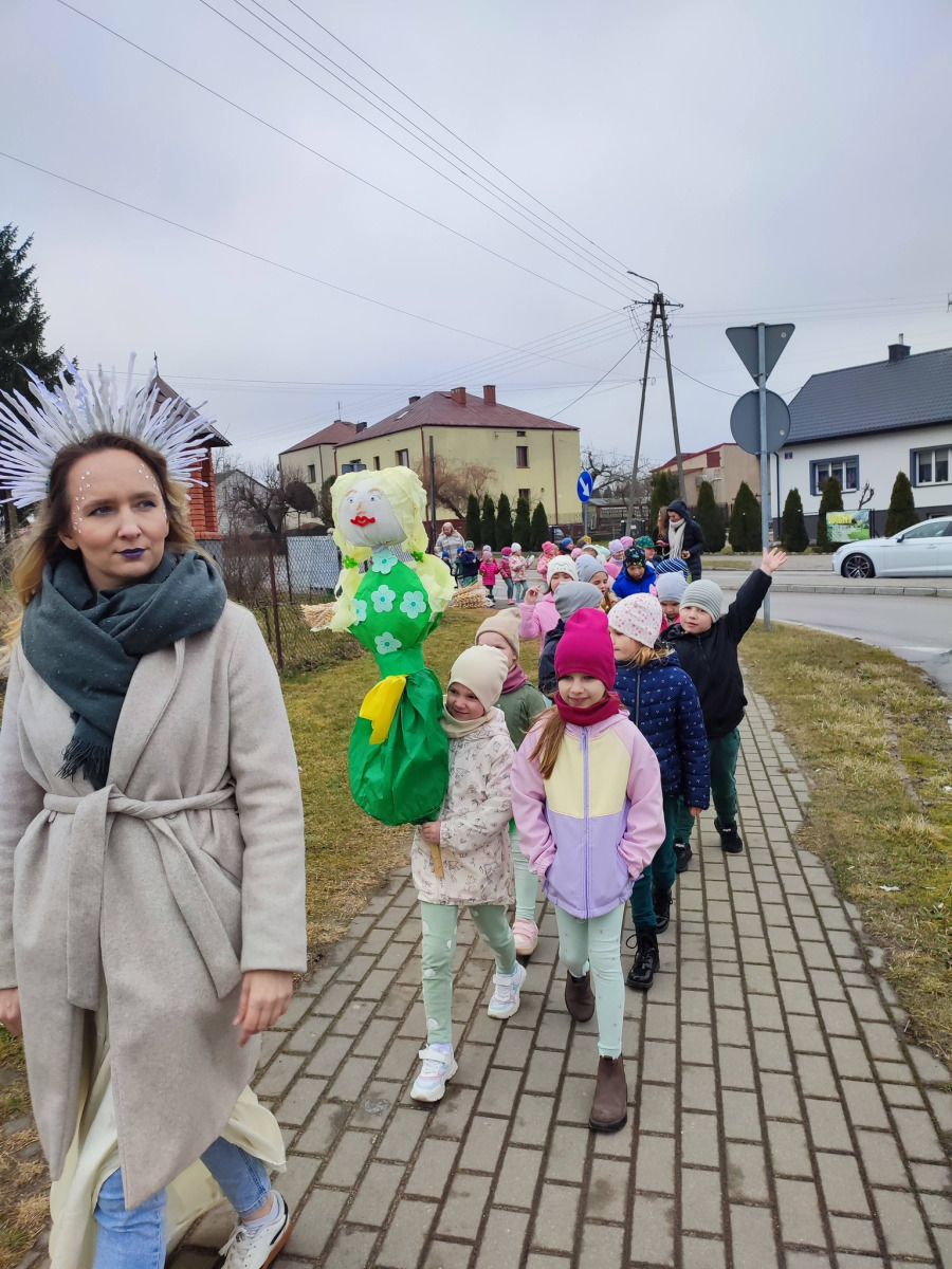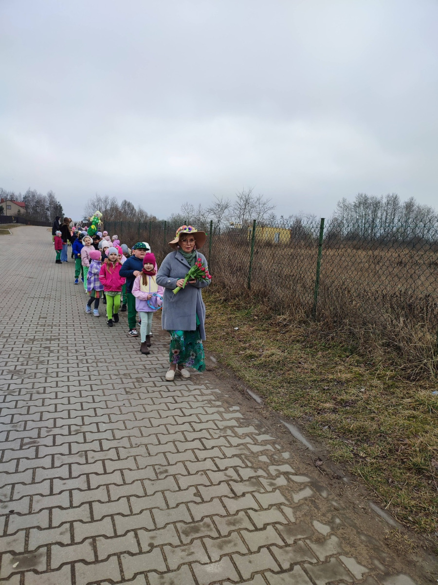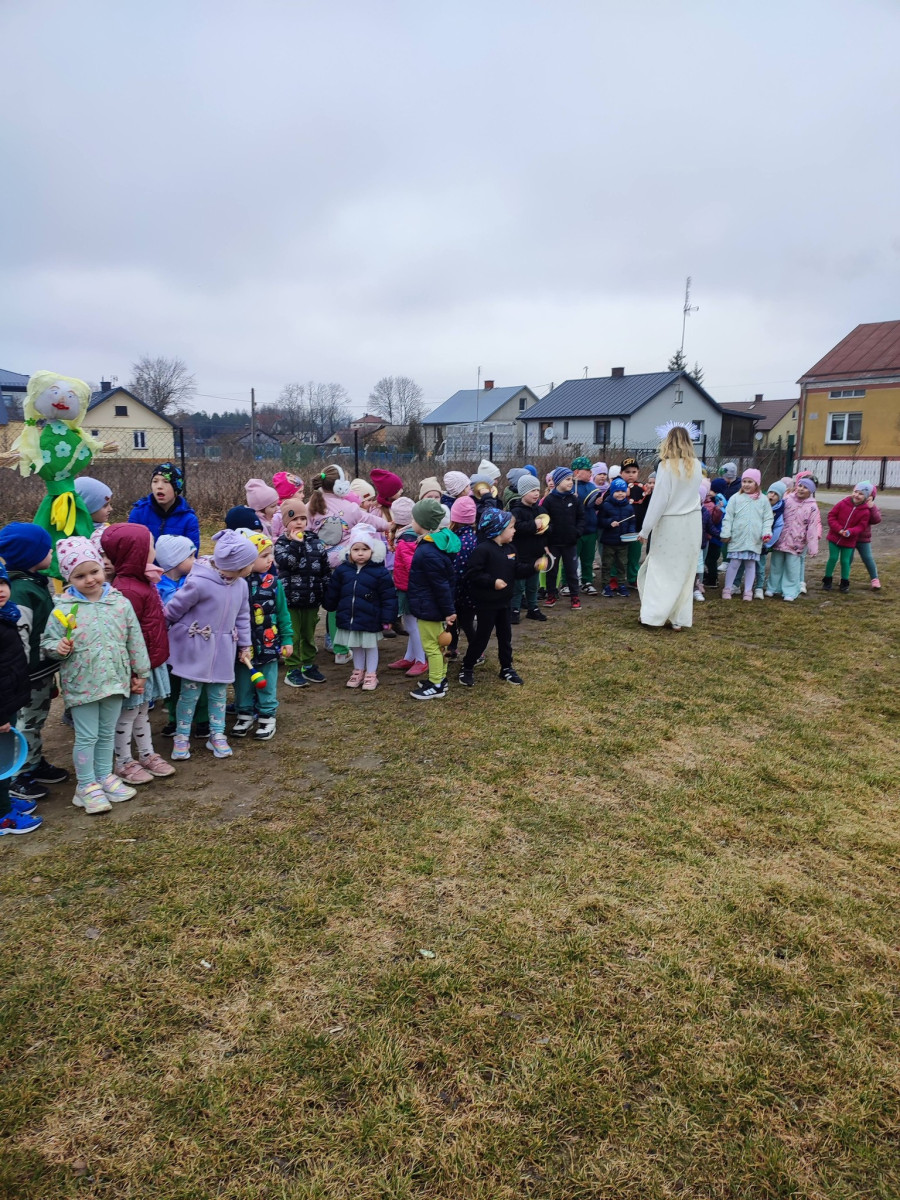 . Przedszkolaki maszerowały ulicami wsi, grając na instrumentach i śpiewając wesołe, wiosenne piosenki. Ich śmiech i muzyka niosły się daleko, jakby budząc przyrodę do życia.