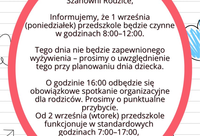 Szanowni Rodzice, Informujemy, że 1 września (poniedziałek) przedszkole będzie czynne w godzinach 8:00–12:00.Tego dnia nie będzie zapewnionego wyżywienia – prosimy o uwzględnienie tego przy planowaniu dnia dziecka. O godzinie 16:00 odbędzie się obowiązkowe spotkanie organizacyjne dla rodziców. Prosimy o punktualne przybycie. Od 2 września (wtorek) przedszkole funkcjonuje w standardowych godzinach […]